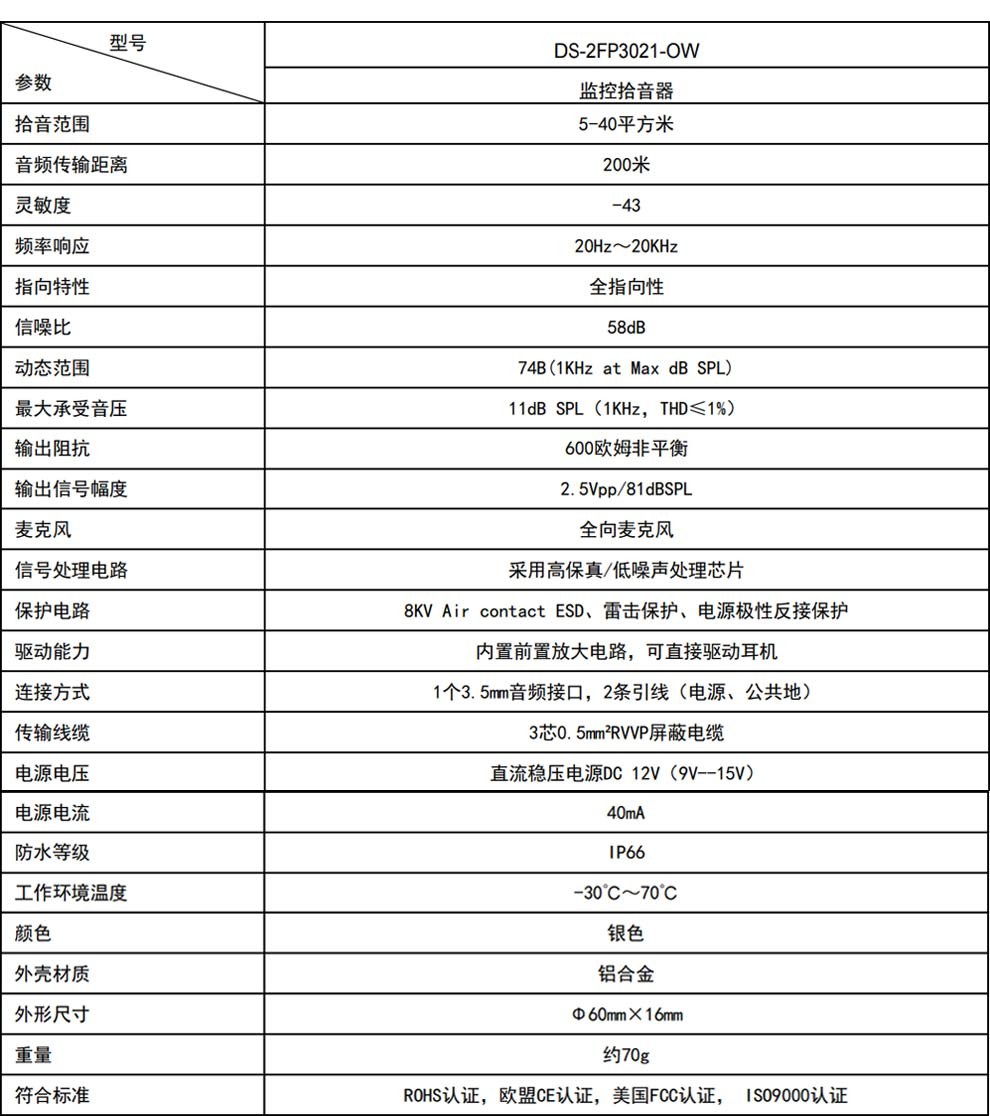 | 商品名称 | HIKVISION拾音器監視防犯カメラ専門 DS-2FP1020-B 全国联保 |
